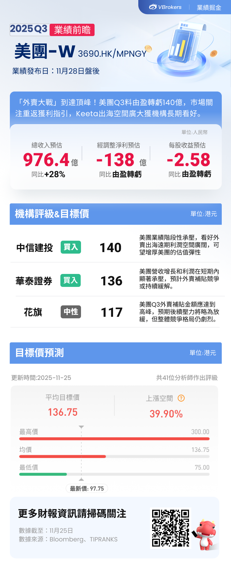華盛資訊11月25日訊,美團-W( $03690.HK / $MPNGY )將於本週五(11月28日)發佈2025財年Q3業績報告。點擊預約美團業績會直播>>
