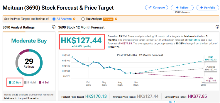 據TipRanks最新數據顯示,自外賣競爭加劇以來,華爾街大行普遍下調美團目標價,目前69%的機構給予“買入”評級,當前平均目標價爲127.4港元,潛在上行空間超30%。