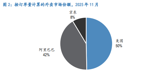 美團以50%的份額(約7100萬日單)保持領先,市佔率下降;阿里巴巴佔據42%(約5900萬日單),而京東則以8%(約1100萬日單)的份額位居第三。