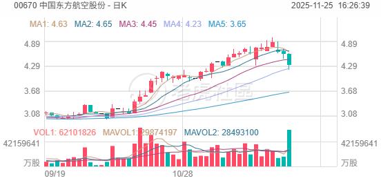 航空股持續回調,中國東方航空股份跌近6%,中國國航跌超3%,中國南方航空股份跌近2%;