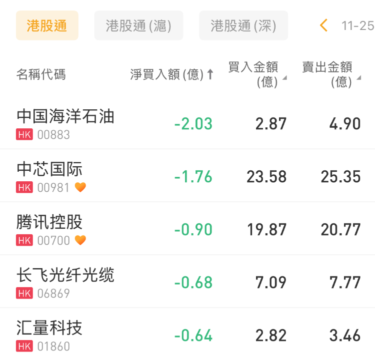 中國海洋石油、中芯國際、騰訊控股分別遭淨賣出2.03億港元、1.76億港元、8998萬港元。
