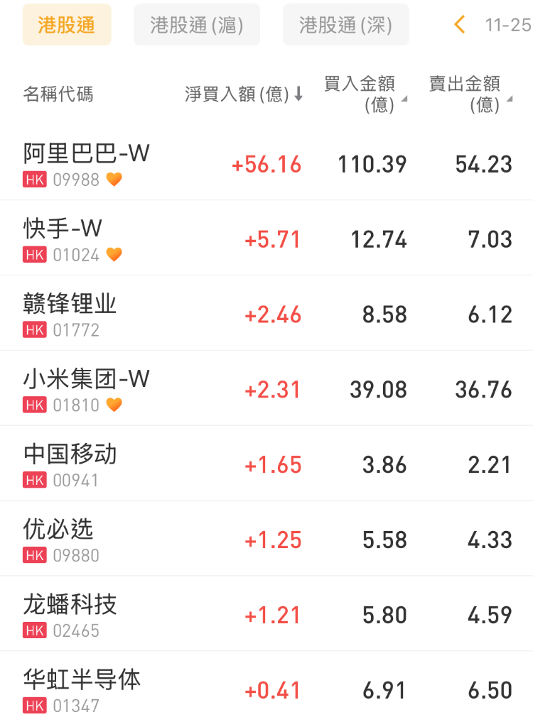 阿里巴巴-W、快手-W、贛鋒鋰業分別獲淨買入56.16億港元、5.71億港元、2.46億港元。