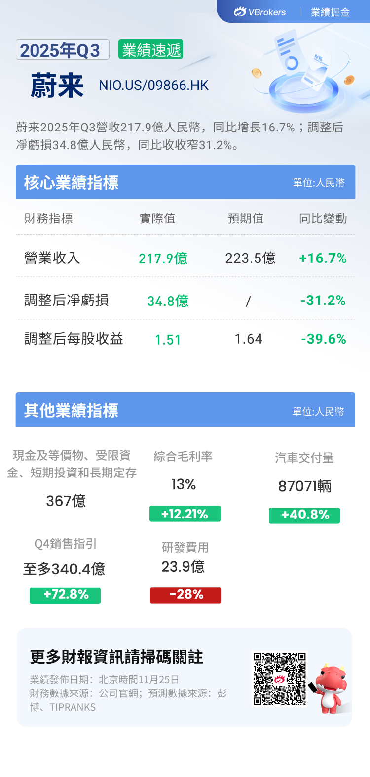 華盛資訊11月25日消息,蔚來 $09866.HK $NIO 今日公佈截至2025年9月30日止的2025財年Q3業績。