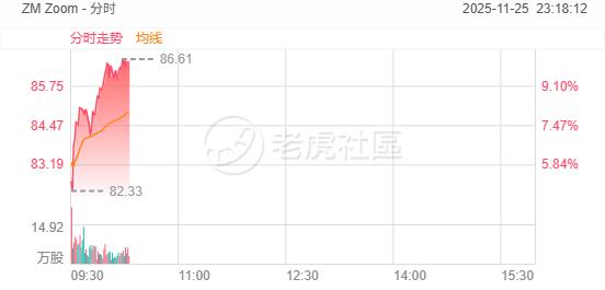 週二, Zoom 盤中大漲超10%。Zoom 2026財年第三季度銷售額同比增長4.4%至12.3億美元,高於分析師預期的12.1億美元;經調整每股盈利1.52美元,亦高於預期的1.44美元。