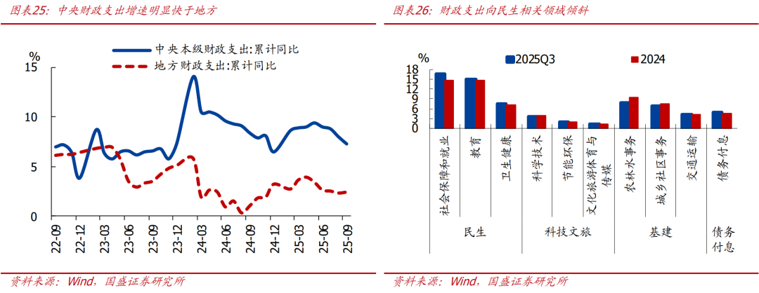 結構上分化明顯,一是中央財政支出明顯快於地方,二是財政支出繼續向民生相關領域傾斜。分央地來看,1-9月中央財政支出累計同比7.3%,明顯快於地方的2.4%,可能與地方債務壓力較大、項目監管審覈趨嚴等有關。分投向來看,1-9月民生相關的社保、教育、衛生健康支出佔比合計39.5%、較2024年底抬升2.8個百分點,其中社保相關支出佔比抬升最多、達2個百分點;農林水、城鄉社區事務、交通運輸支出佔比相應下降2.8個百分點。此外,債務付息壓力也逐步加大,債務付息相關支出佔比達4.72%、較2024年底抬升0.19個百分點。