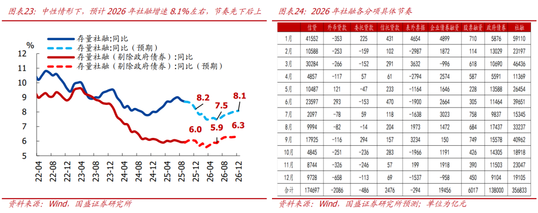 社融:財政赤字、專項債等規模整體可能與2025年相當,外幣貸款、股權融資、企業債券融資有望邊際改善,預計整體社融規模在35.7萬億,對應存量社融增速在8.1%左右,節奏上先下後上。年內看,雖然房地產延續走弱、企業投資意願偏弱,但政策性金融工具加碼,有望形成對沖、10-12月社融同比小幅少增,全年新增社融規模約34.8萬億。展望2026年,信貸如上所述在17.1-18.1萬億左右,政府債券參考財政部分假設爲11.8萬億+2萬億(特殊再融資債),其餘分項方面:外幣貸款,匯率升值背景下外幣貸款降幅收窄10%;委託貸款、信託貸款參考過去3年均值,表外票據衝量需求減弱,參考2025年水平;企業融資需求改善,企業債券融資增加10%;股權融資邊際改善,同比多增40%。匯總上述假設,得到最終社融規模約35-36萬億,對應社融增速在8.0%-8.2%左右,中性情形下新增社融規模35.7萬億、同比8.1%。節奏上,綜合政府債券發行節奏前置、基數效應等,預計社融增速先下後上。