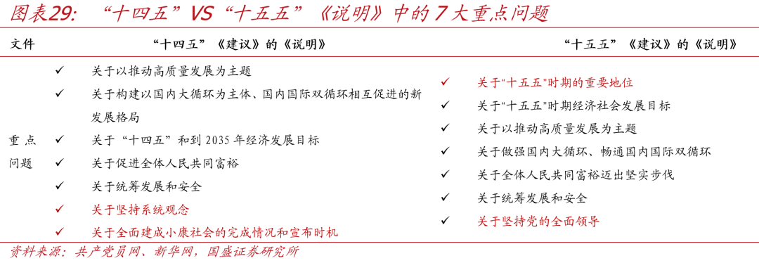 總基調和原則上,延續“穩重求進”,延續強調推動高質量發展、改革創新、改善民生、堅持黨的全面領導等,重提“堅持以經濟建設爲中心”,且更爲突出“人”,包括“投資於人”“中國人經濟”、重視GNI等。其中,在“十五五”謀篇佈局上多處突出“人”,包括:注重在發展中保障和改善民生,在滿足民生需求中拓展發展空間;堅持惠民生和促消費、投資於物和投資於人緊密結合;既要看GDP,也要看GNI;既重視“中國經濟”,也重視“中國人經濟”等。此外,兩次對於規劃《建議》的《說明》均對7大問題做了重點說明,相同的有5大問題:規劃期主要目標、推動高質量發展、“雙循環”、“共同富裕”、統籌發展和安全;本次替換了2大問題:“十五五”時期的重要地位、堅持黨的領導。