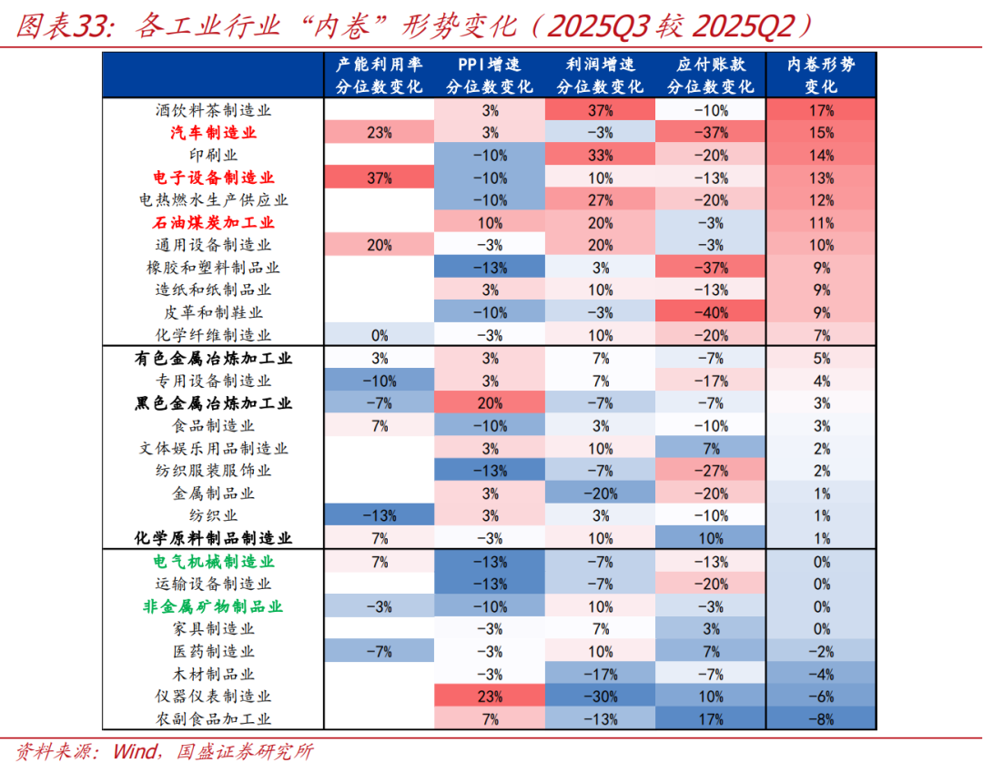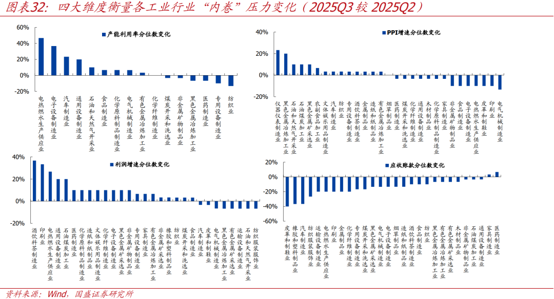 中觀看,哪些行業“反內卷”效果最好?可從價格、利潤、產能利用率、應付賬款四大維度衡量:我們在此前報告《調整就是機會—2025年中期經濟與資產展望》中指出,可從價格、利潤、產能利用率、應付賬款四大維度衡量各行業的內卷壓力。在此基礎上,可比較相應指標2025年Q3較Q2的分位數變化,衡量各行業的“反內卷”效果。