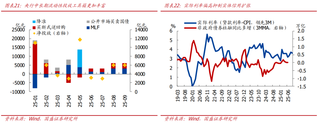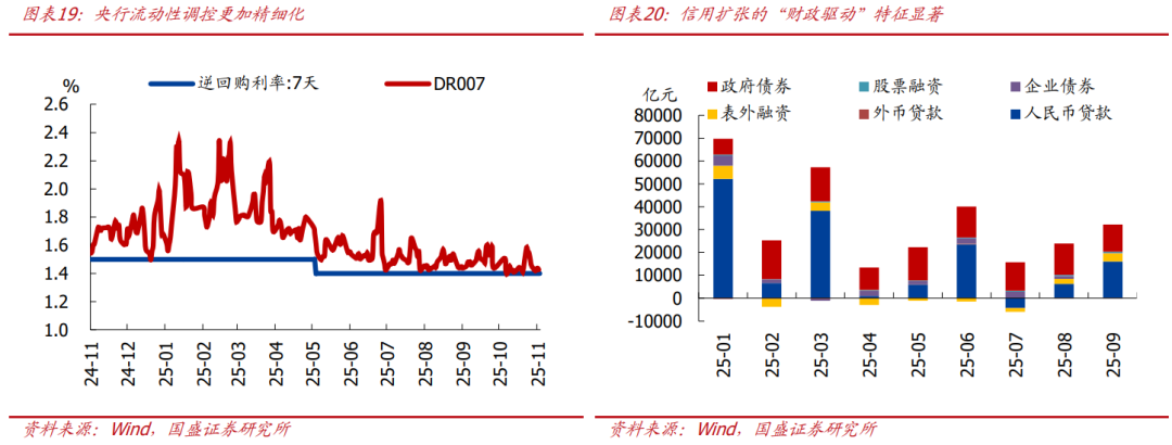 回顧2025年,貨幣政策整體延續寬鬆,但操作思路有變化,更加註重信貸質量,流動性管理也更加精細化,降準降息各1次,信用擴張的“財政驅動”特徵顯著,經濟內生動能仍偏弱、需求不足的問題仍凸出。與2024年相同,2025年整體貨幣政策定調繼續延續寬鬆,但在操作思路上有所調整,主要體現在兩方面:一是進一步弱化對信貸的規模考覈,強調要摒棄“規模情節”,更加重視信貸質量;二是銀行間市場流動性調控更加精細化、整體迴歸中性,尤其是在利率快速下行階段,通過主動收緊流動性來避免滾隔夜等行爲加速利率下行。具體來看,分爲三個階段:
