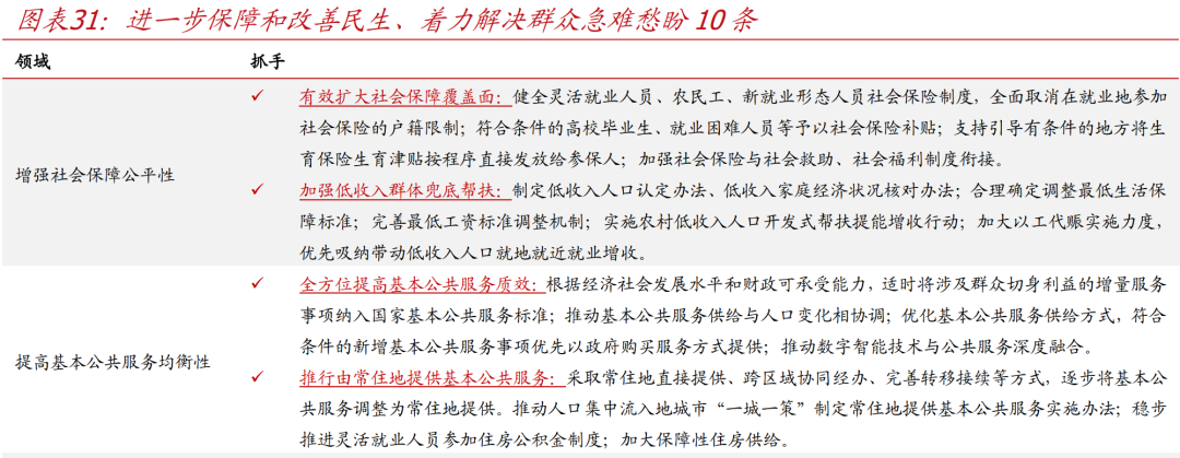 第四,“中國式現代化,民生爲大”,短期解決急難愁盼、中長期繼續錨定“共同富裕”,突出“一老一小”等。即短期關注2025.6.9中共中央辦公廳、國務院辦公廳已圍繞“公平、均衡、普惠、可及”,提出10條舉措解決羣衆急難愁盼,應會繼續抓好落實。此外,突出“一老一小”,後續動作包括:發揮育兒補貼、個稅抵扣等政策的綜合作用;深入開展托育服務補助示範試點;優化基本養老服務供給;發展醫育、醫養結合服務;穩妥實施漸進式延遲法定退休年齡,優化就業、社保等方面的年齡限制政策,積極開發老年人力資源,發展銀髮經濟等。
