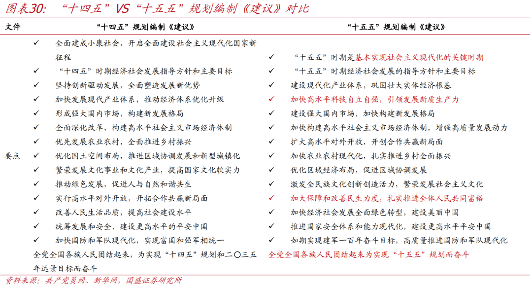 目標上,細化部署了“十五五”時期12項主要任務,延續2035年GDP翻番目標,新增2035年實現“國防實力、國際影響力大幅躍升”,新提“航天強國”建設等。其中,12項任務包括產業、科技、擴內需、改革、民生、生態、對外開放、區域、文化、農業農村、安全、國防和軍隊建設,但順序上調整較大、相應體現了後續“優先級”變化,體現爲:科技和產業發展仍靠前、且“建設現代化產業體系”移至首位;對外開放由第9位移至第5位、由“實行”改爲“擴大”;民生由第10位移至第9位,並直指“紮實推進全體人民共同富裕”。此外,延續“十四五”時期“經濟實力、科技實力、綜合國力躍上新臺階”,新提要求“國防實力、國際影響力大幅躍升”。