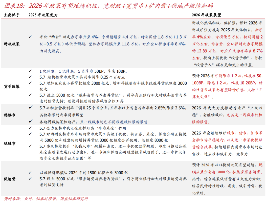 核心結論:展望2026年,作爲“十五五”開局之年,政策“全面發力”可期,主基調偏積極、偏擴張、偏刺激,進一步中央加槓桿、松貨幣、寬財政,促消費、拉基建、強產業、穩地產、促改革。
