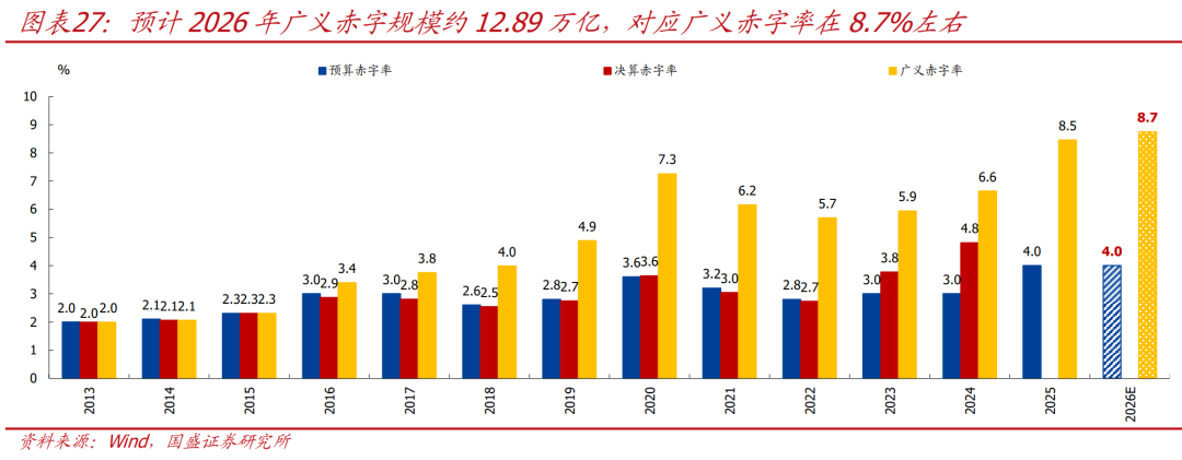 >規模上,1)赤字率:考慮到2025年赤字率已經處於歷史較高水平,進一步提升赤字率可能影響財政的可持續性,因此2026年赤字率可能維持在4%左右,對應赤字規模5.89萬億;2)特別國債:預計2萬億左右,其中1萬億爲2024年安排的超長期特別國債,剩餘1萬億用於刺激消費、支持國家重大項目建設等,消費券投向範圍有望拓展到更多品類和服務消費領域,To B領域也可能出臺“專業消費券”、促進“兩業融合”;3)專項債:規模可能進一步升至5萬億,主要是考慮到“十五五”開年地方積極發力、專項債規模擴張、進一步助力地方政府償還拖欠企業賬款等。4)綜合來看,2026年全口徑財政赤字規模約12.89萬億(5.89+2+5),對應廣義赤字率在8.7%左右、較2025年進一步抬升0.2個百分點,廣義財政支出規模有望達43萬億、同比多增1.13萬億。需要注意的是,2025年來財政相機抉擇特徵也更加突出,年中至三季度仍可能根據經濟實際情況相機加碼;同時,伴隨化債、政府角色轉變等,財政效率也有望迎來改善。