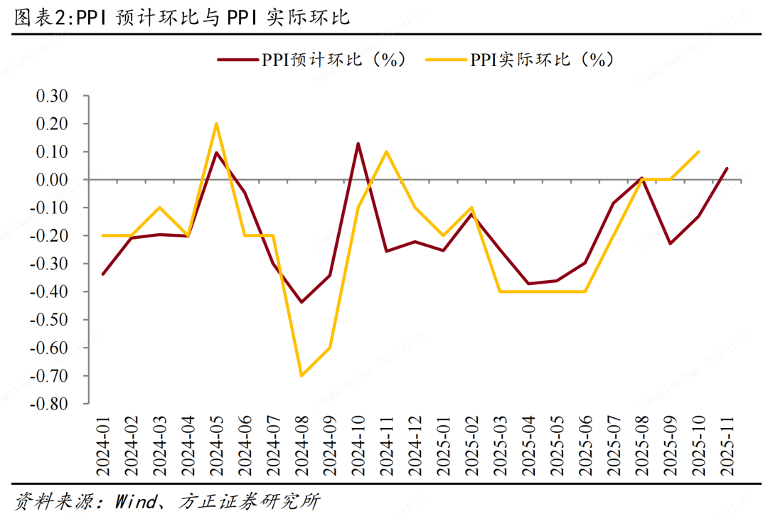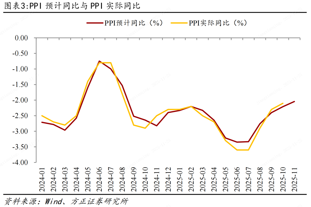 基於上述流通領域生產資料價格變動情況,我們預測11月PPI環比+0.04%(前值+0.1%)(圖表2);預計11月PPI同比降幅爲-2.0%,同比降幅較前值-2.1%小幅收窄(圖表3)。