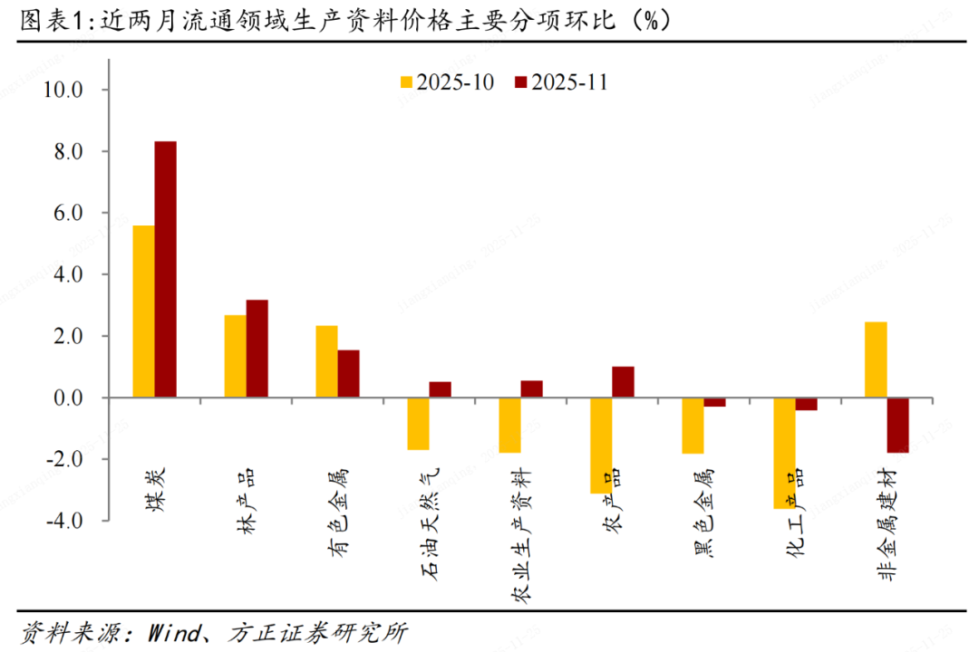 根據國家統計局發佈的2025年11月中旬流通領域生產資料價格變動情況,2025年11月流通領域生產資料價格環比上漲(+1.4%,前值+0.1%),各分項表現如下(圖表1):