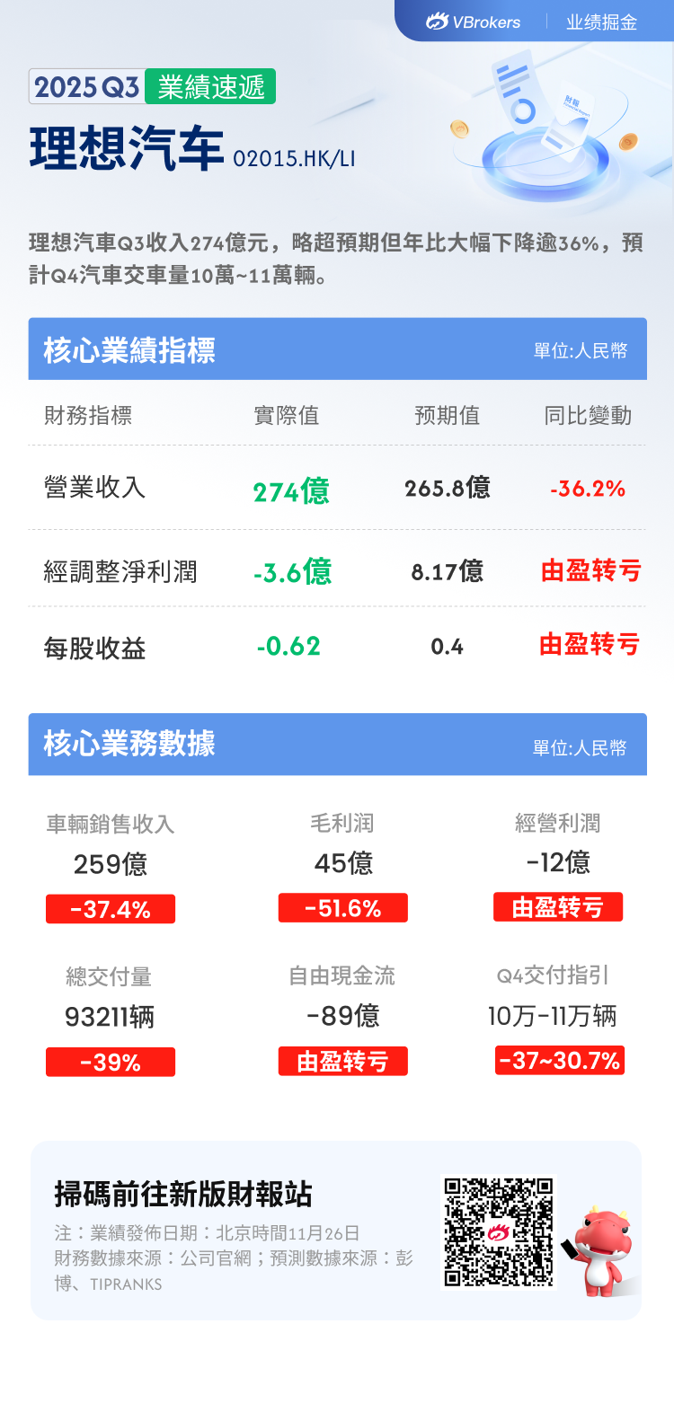 華盛資訊11月26日訊,理想汽車( $02015.HK / $LI )今日公佈截至2025年9月30日止的2025財年Q3業績。