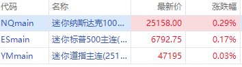 週三盤前,三大股指期貨盤前齊漲,截至發稿,納指期貨 $NQmain 漲0.29%,標普500期貨 $ESmain 漲0.17%,道指期貨 $YMmain 漲0.03%。