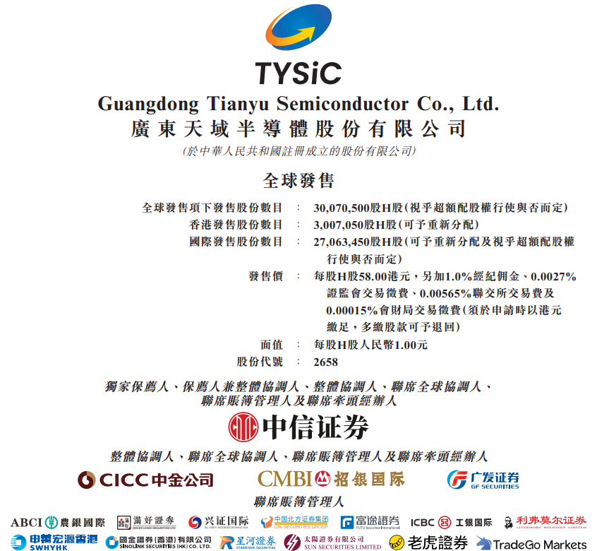 11月27日,天域半導體於11月27日至12月2日招股,公司擬全球發售3007.05萬股H股,香港公開發售佔10%,國際發售佔90%,另有15%超額配股權。發售價將爲每股發售股份58.00港元,每手50股,預期H股將於12月5日在聯交所買賣。