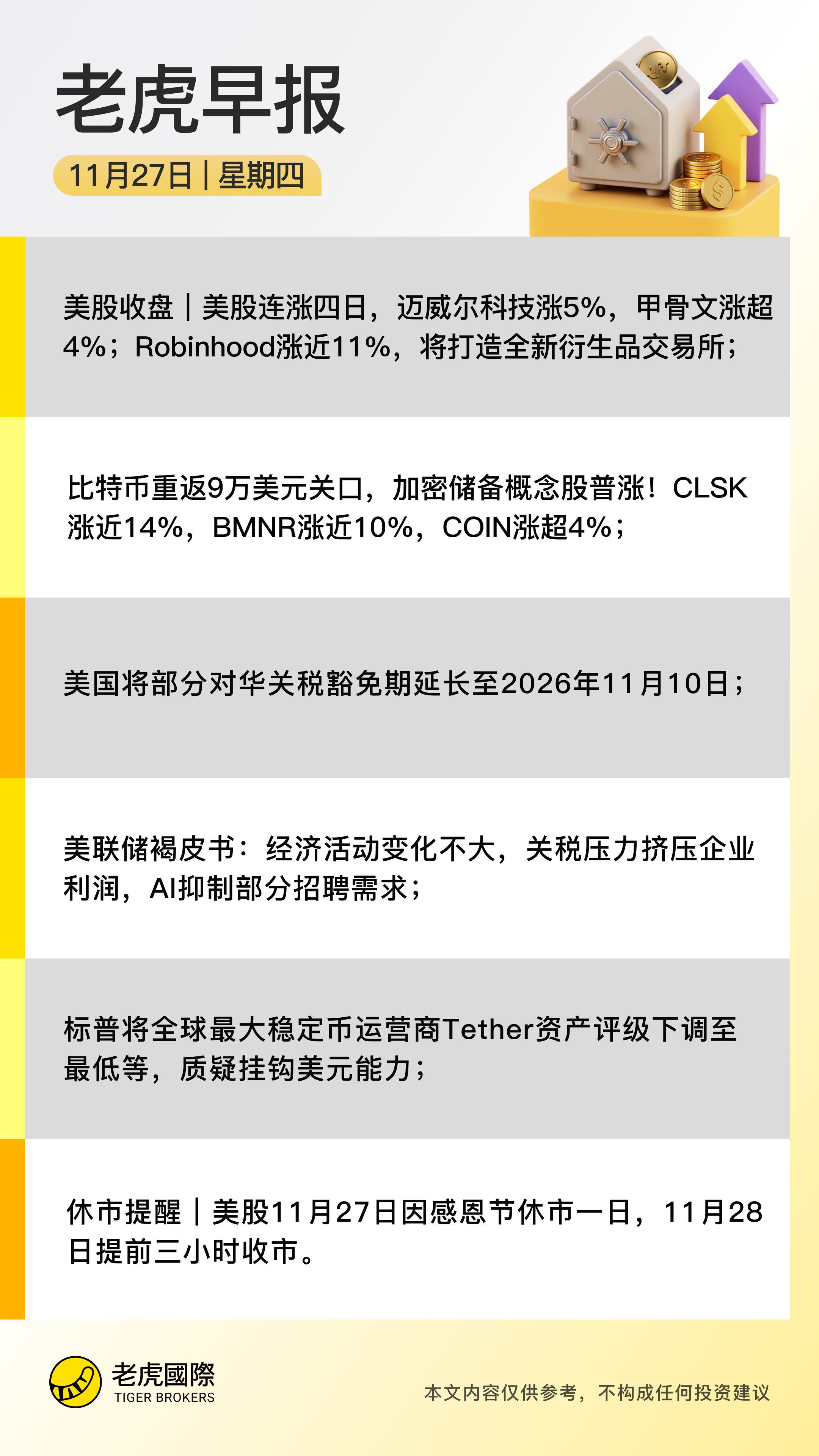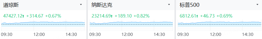 週三(11月26日),美股三大指數連漲四日。截至收盤,道瓊斯指數漲0.67%,報47427.12點;標普500指數漲0.69%,報6812.61點;納斯達克綜合指數漲0.82%,報23214.69點。