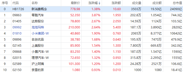 華盛資訊11月27日訊,港股新消費概念股盤初集體上揚,截止發稿,零跑汽車漲近4%,泡泡瑪特漲超2%,小米集團-W、名創優品漲超1%。