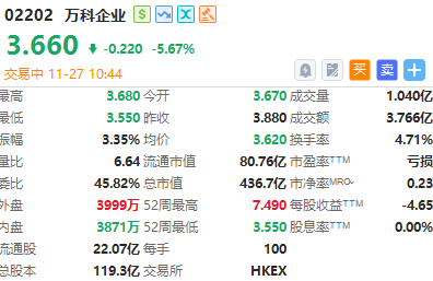 華盛資訊11月27日訊,萬科企業港股大幅低開,截至發稿,跌超5%。