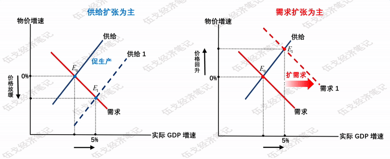 實現同樣的經濟增速目標,其實存在多種路徑,也對應着多種量價均衡。簡言之,若需求擴張快於供給,則對物價有提振;反之,則存在壓制的可能。