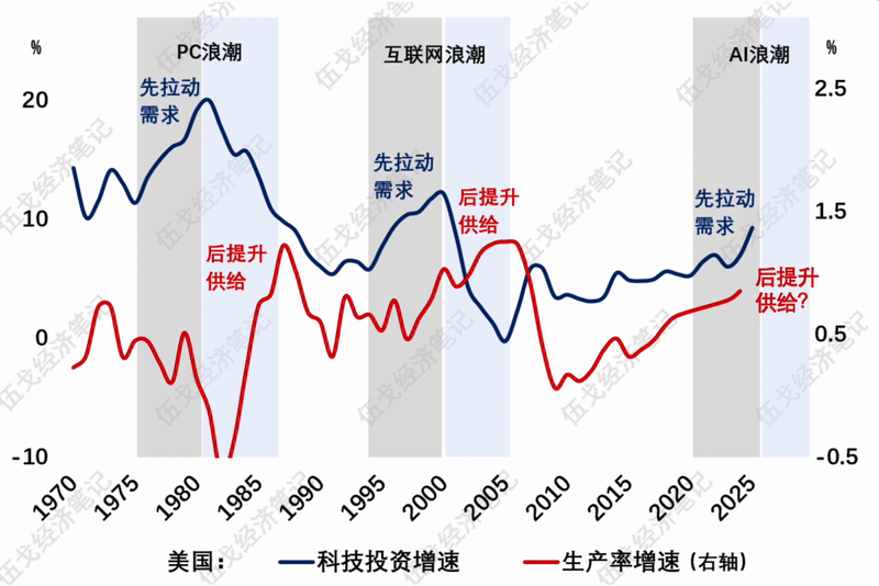 當前市場對AI存在“泡沫”與否的爭議,但全球來看,相關投資正拉動上下游增長,應用前景短期似難證僞。今年以來美國科技相關投資對其GDP增長的貢獻度高達6-7成。史實表明,科技當期拉動投資需求,未來提升供給能力,對物價是先升後降的非線性影響。