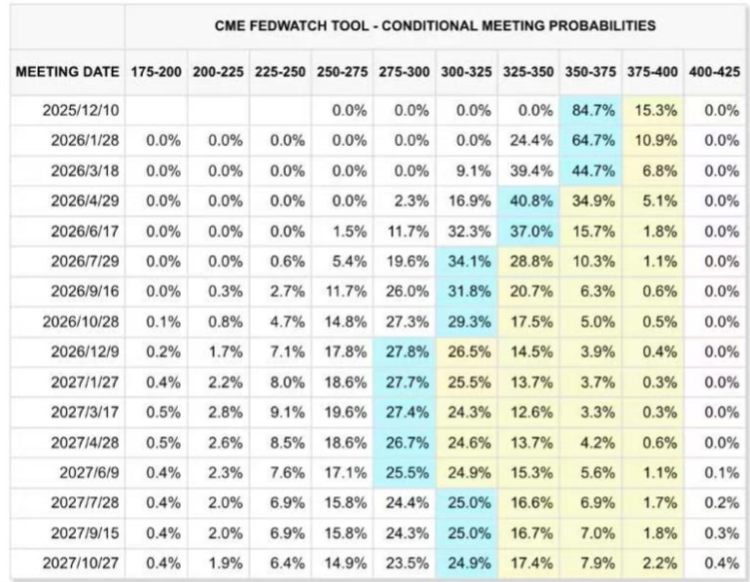 華盛資訊11月27日訊,美聯儲降息概率持續提升!週三,在美聯儲發佈最新經濟《褐皮書》、兩位官員發表支持降息言論後,市場進一步押注12月降息。據CME“美聯儲觀察”,美聯儲12月降息25個基點的概率已升至84.7%,維持利率不變的概率爲15.3%。