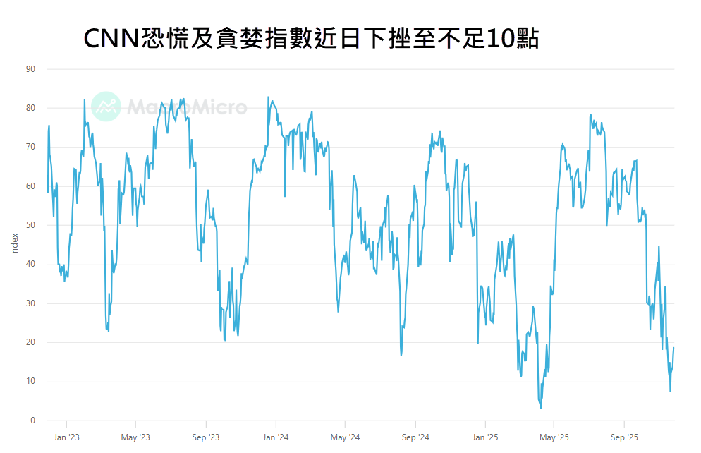 金吾財訊 | 上週(17-21日),美股依然受制於市場對 AI 泡沫、減息週期延後、以及經濟增長可能放緩的擔憂,走勢持續疲弱。標普 500 指數更曾先後跌穿 20 天、50 天及 100 天移動平均線,並於上週四(20 日)低見 6,538 點,創下逾兩個月新低。市場情緒亦顯着轉差;根據 CNN 編制、由七項市場指標整合而成的恐慌及貪婪指數(Fear and Greed Index,FGI),上週四曾急挫至 7.2 點的“極度恐慌”(Extreme Fear)區域(圖 1),反映當時市場正出現恐慌性拋售。