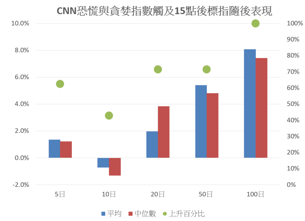儘管如此,若拉長觀察時間至 20 個交易日或以上,標普 500 的後市表現則明顯改善,升幅穩步上揚,且上升機率更超過七成(圖 2)。換言之,隨着上週市場情緒急挫至極度恐慌區域,歷史經驗顯示美股短期確有較高機會出現反彈,特別是在首周內;而在較長時間窗口(20 至 100 個交易日)下,後市向好的概率亦相對較高。
