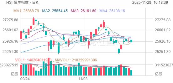 11月28日,港股三大指數走勢分化,恒生指數、國企指數分別下跌0.34%及0.38%,恒指盤中曾短暫回到26000上方,恒生科技指數微漲0.02%表現相對平穩。