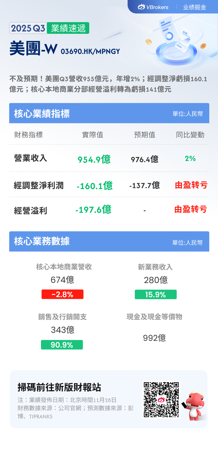 華盛資訊11月27日訊,美團-W( $03690.HK )今日公佈截至2025年9月30日止的Q3業績。