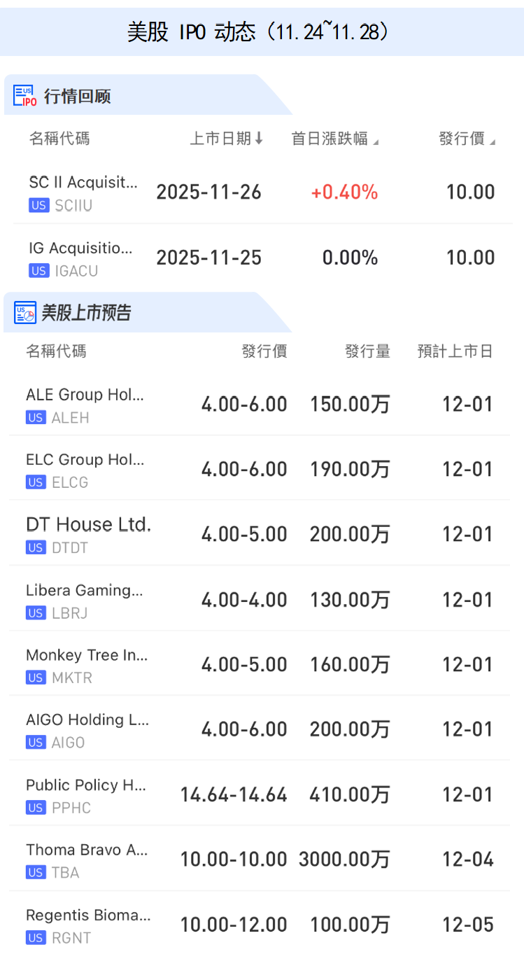 美股方面,本週2家空白支票公司上市,香港健康服務商機能再生 $AVG 等9只新股計劃下週上市。