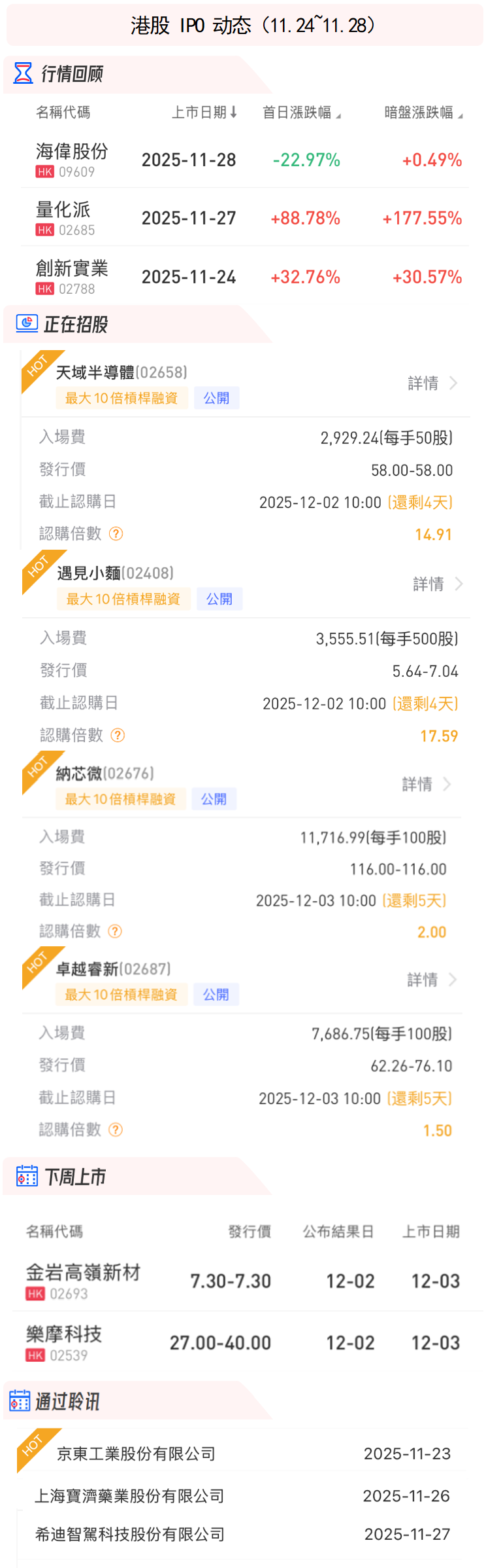 華盛資訊11月28日消息,本週港股IPO市場進入年末“打新潮”,遇見小面等4只新股正在招股中,3只新股於本週上市,其中量化派首日暴漲90%;此外,樂摩科技等2只新股本週完成招股,將於下週上市。