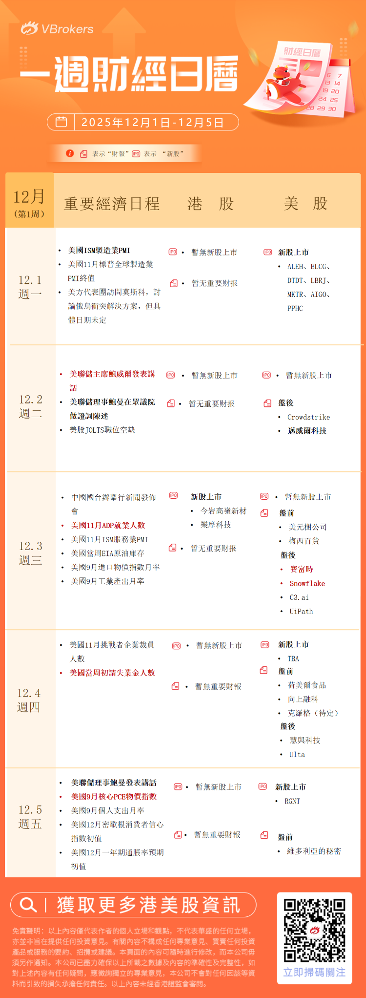 美股方面,預計下週預計有9只新股上市 週一(12.1): $ALEH 、$ELCG 、$DTDT 、$LBRJ 、$MKTR 、$AIGO 、$PPHC 週四(12.4): $TBA 週五(12.4): $RGNT |
