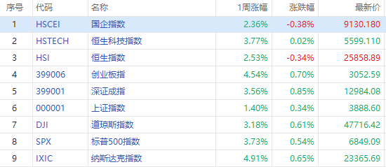 港股方面,本週恒生指數漲2.53%,報25858.89點;恒生科技指數漲3.77%,報5599.11點;國企指數漲2.36%,報9130.18點;