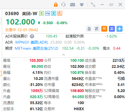 華盛資訊12月1日訊,美團-W績後一度轉漲,現跌約0.5%,消息面上,公司近三年來首次季度虧損,第三季度調整後淨虧損160億元人民幣,管理層電話會稱:虧損已見頂,進行必要投入以維持領導地位,但不會參與價格戰。