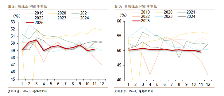 核心觀點:11 月 PMI 顯示經濟景氣延續弱勢,製造業雖小幅回升但仍處收縮區間,服務業明顯走弱,整體修復態勢偏弱。製造業PMI 回升至49.2%,但仍弱於往年同期水平,我們認爲這既反映了“十一”假期後的季節性修復有限、前期“以舊換新”對訂單的拉動效應邊際減退,也與全球需求仍偏低迷有關。分項指標上,生產與新訂單雖小幅改善但仍低於榮枯線,企業繼續主動去庫、用工偏謹慎,顯示製造業內生復甦動能依舊不足。非製造業PMI回落至49.5%,重回榮枯線下,疊加假期效應消退,服務業動能減弱、建築業雖有回升但仍偏弱,新訂單與庫存指標均指向需求承接不足。當前國內供需兩端均處於疲弱狀態,景氣結構性的分化仍未改善,企業經營預期雖略有回升,但短期內仍缺乏明顯驅動。值得關注的是,11月中美元首通話推動貿易層面出現邊際緩和,有望減少外需與供應鏈的不確定性;但考慮到外部經濟整體偏弱,其正向拉動仍較有限。展望12月,政策與全球流動性進入關鍵窗口:國內將召開政治局會議與中央經濟工作會議,關係到 2026年經濟目標與政策定調;外部則聚焦12月10日美聯儲議息會議,其對全球資金成本與風險偏好的影響不容忽視。整體來看,11月供需弱勢疊加政策真空期,經濟向上動能偏弱,後續修復或更多取決於政治局會議與中央經濟工作會議定調後的政策強度,以及外部金融環境是否進一步改善。