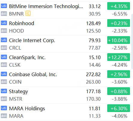 加密貨幣概念股集體下挫,BitMine跌超6%,CleanSpark、MARA Holdings跌超4%,Strategy、Coinbase跌超3%, Robinhood、Circle跌超2%。