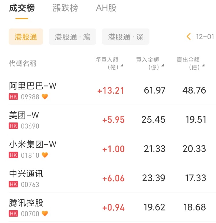 阿里巴巴-W、中興通訊、美團-W分別獲淨買入13.21億港元、6.06億港元、5.95億港元;