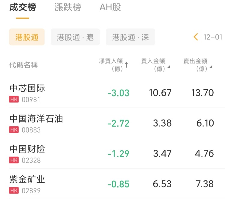 中芯國際、中國海洋石油、中國財險分別遭淨賣出3.03億港元、2.72億港元、1.29億港元。