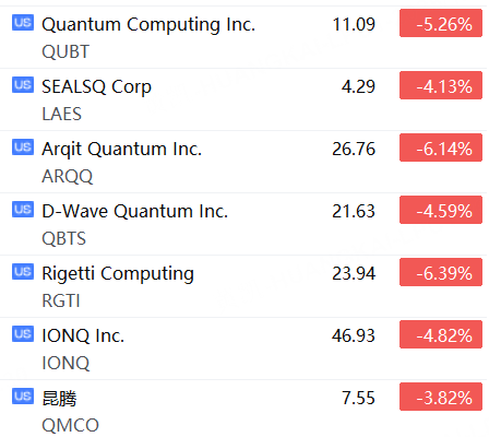 12月1日,量子計算概念股盤中下跌,Rigetti Computing、Arqit QuantumInc.跌超6%,Quantum Computing Inc.跌超5%,IONQ Inc.、D-Wave Quantum Inc.、SEALSQ Corp跌超4%,昆騰跌近4%。