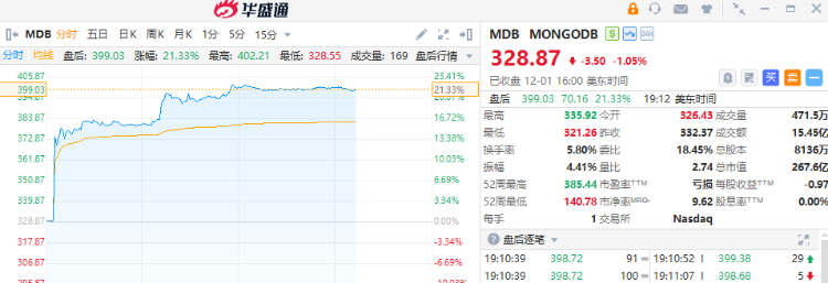 MongoDB美股盤後股價飆升,此前這家軟件公司在公佈遠超預期的第三季度盈利後提高了年度業績預期,這主要得益於其 Atlas 雲數據管理服務需求的增長。