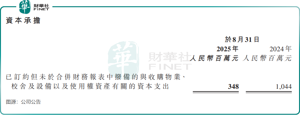 除了核心盈利指標增速跑赢行業,公司資本開支的下降也帶動了自由現金流的釋放。於2025年8月底,公司現金儲備達67.44億元,完全覆蓋短期流動性需求;同時,資本開支從上一財年的48.57億元大幅降至26.6億元,已簽約未撥備的資本承擔也從上一財年的10.44億元降至3.48億元,預示著未來自由現金流釋放潛力巨大。