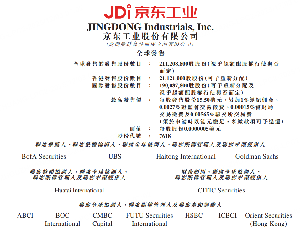 12月3日,京東工業(07618)於12月3日至12月8日招股,公司擬全球發售2.11億股,香港公開發售佔10%,國際發售佔90%,另有約15%超額配股權。每股發售價12.7港元-15.5港元,每手200股,預期股份將於12月11日開始在聯交所交易。