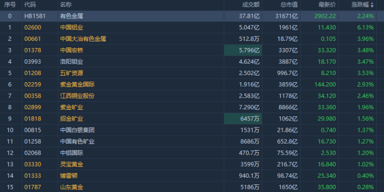 華盛資訊12月3日訊,有色金屬股逆勢走強,截至發稿,中國鋁業漲超6%,中國宏橋、洛陽鉬業、五礦資源漲超3%,紫金黃金國際、江西銅業股份漲超2%。