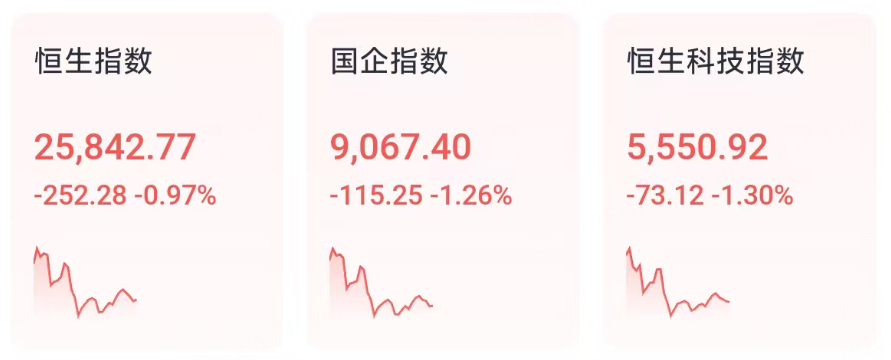 12月3日週三,港股三大指數上午均走低,恒生指數午間收跌0.97%再失26000點,國企指數、恒生科技指數分別下跌1.26%及1.3%。