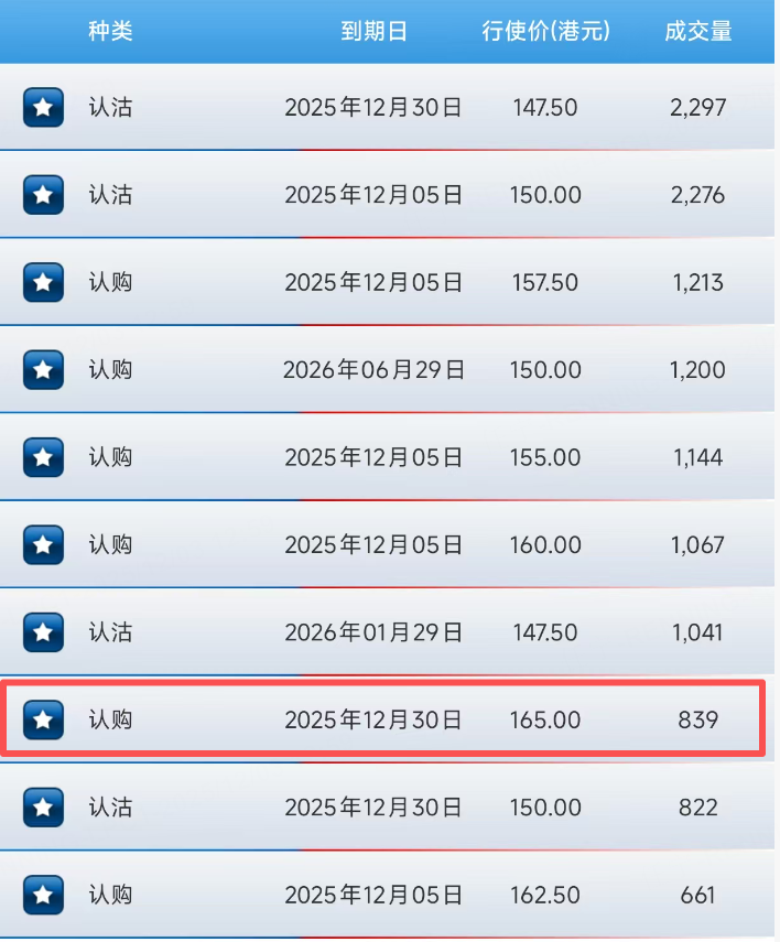 阿里巴巴-W 上午跌近2%,期權成交排名前兩位的都是認沽合約。不過,一份12月30日到期的認購合約,行權價達165港元,較現價有7%的漲幅空間。