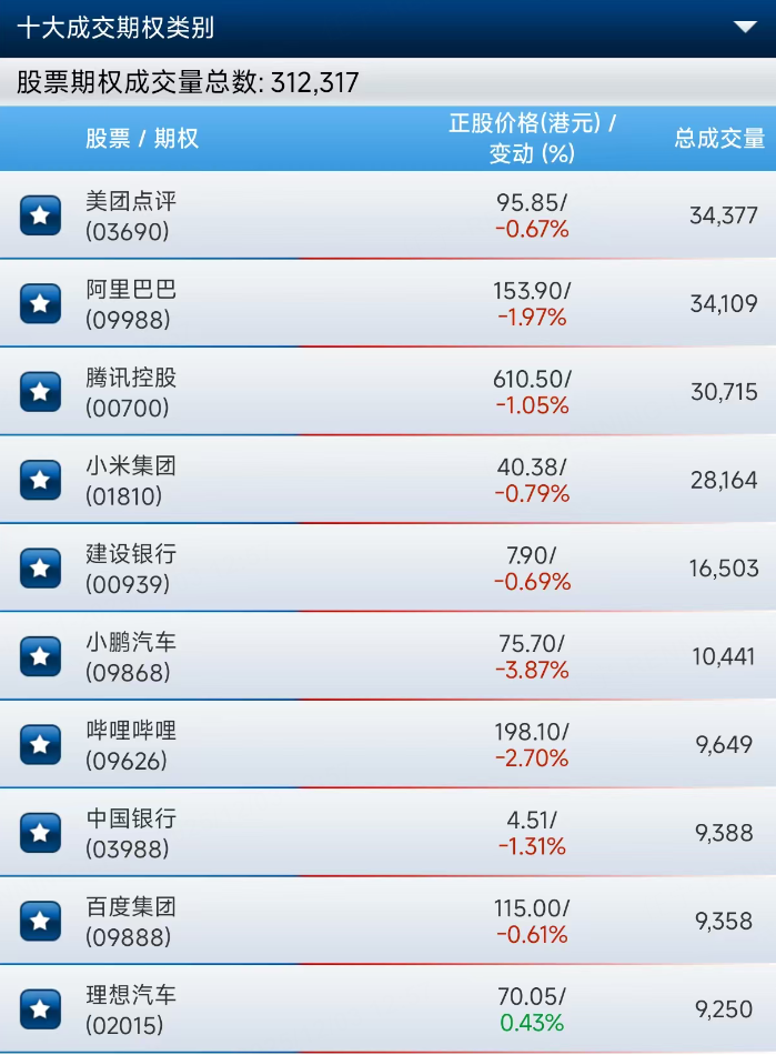 港股期權上午成交312317張合約。其中, 美團-W 排名榜首,成交34377張。阿里、騰訊、小米集團緊隨其後。