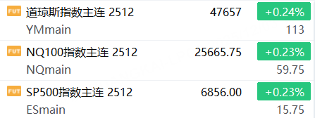 12月3日,美股三大股指期貨上漲,截止發稿,道指期貨漲0.24%,納指期貨漲0.23%,標普500指數期貨漲0.23%。